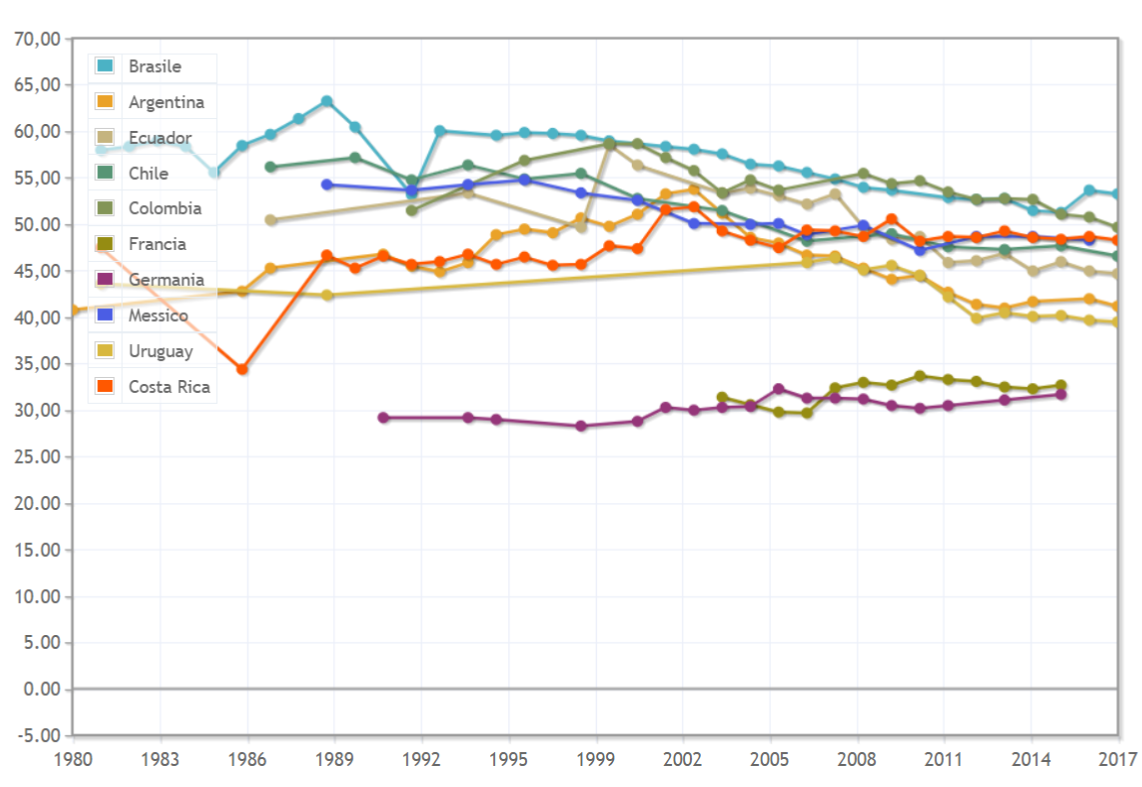 Figura 2: Indice di Gini in alcuni Paesi dell’America latina e per confronto anche in Germania e Francia. N.b: Un indice di Gini pari a 0 simboleggia perfetta uguaglianza tra gli individui di una società; un indice di Gini pari a 100 simboleggia massima diseguaglianza. (dati tratti dalla Banca mondiale).