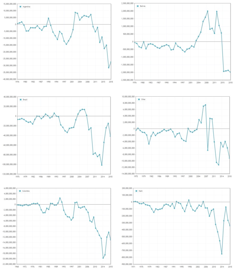 Figura 1: Andamento delle partite correnti in alcuni Paesi dell’America latina (dati tratti dal sito della Banca mondiale).
